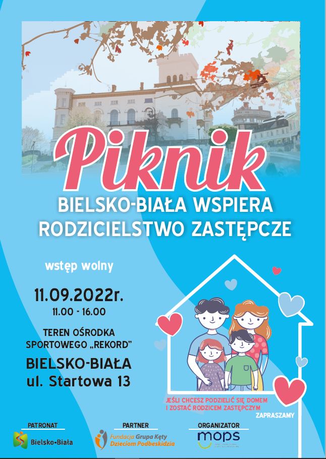 Po trzech latach przerwy wracamy z zapałem do spotkania się z rodzinami zastępczymi podczas Pikniku w dniu 11 września 2022 roku w Cygańskim Lesie na terenie Ośrodka Sportowego Rekord przy ulicy Startowej 13, w godzinach od 11.00 do 16.00. Tym razem Piknik Rodzicielstwa Zastępczego będzie miał charakter otwarty. Zapraszamy wszystkich mieszkańców miasta Bielska-Białej, których interesuje temat pieczy zastępczej lub zastanawiają się nad założeniem rodziny zastępczej! Podczas Pikniku będzie możliwość osobistego spotkania się z rodzinami zastępczymi i porozmawiania o tym czy warto zapewnić ciepłe i bezpieczne środowisko rodzinne dla dzieci pozbawionych opieki. Z pracownikami tutejszego Ośrodka porozmawiacie jak to zrobić i od czego zacząć. Planowane są liczne atrakcje dla dzieci takie jak dmuchańce, karuzela, fotobudka, malowanie twarzy, eurobudgee, gry i konkursy z nagrodami, popcorn i wata cukrowa, z których dzieci mogą korzystać bez ograniczeń. Piknik zostanie oficjalnie rozpoczęty o godzinie 11.00 wystąpieniem Prezydenta miasta Bielska-Białej. Razem z nami będzie Fundacja Grupa Kęty Dzieciom Podbeskidzia, która jest Partnerem projektu "Podziel się domem" i wspiera nas we wszystkim.