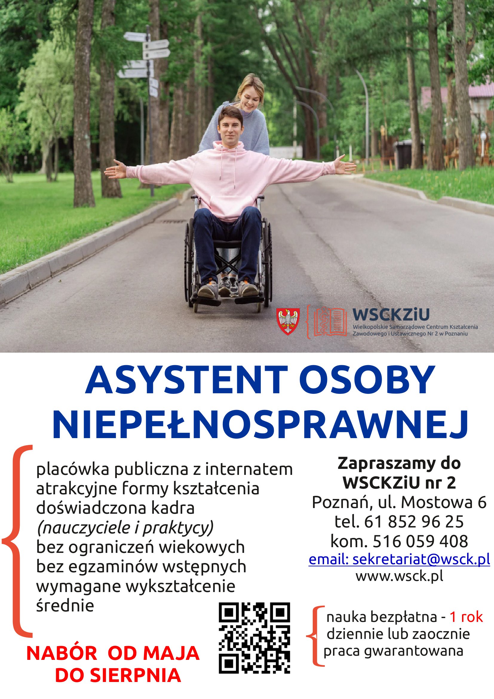 Opis alternatywny plakatu dotyczącego nauki w zawodzie asystent osoby niepełnosprawnej: zdjęcie w górnej części plakatu przedstawi dziewczynę stojącą za plecami chłopaka siedzącego na wózku inwalidzkim. Chłopak ma rozłożone i wyprostowane ramiona, ujęcie w uliczce asfaltowej, po obu stronach w tle ogromne drzewa. W prawym dolnym rogu logo Wielkopolskiego Samorządowego Centrum Szkolenia Zawodowego i Ustawicznego Nr 2 w Poznaniu. Pod zdjęciem widnieje napis: Asystent Osoby Niepełnosprawnej. Poniżej po stronie lewej napisano: placówka publiczna z internatem, atrakcyjne formy kształcenia, doświadczona kadra (nauczyciele i praktycy), bez ograniczeń wiekowych, bez egzaminów wstępnych, wymagane wykształcenie średnie. Pod tekstem napis: Nabór od maja do sierpnia. Obok napisu znajduje się kod QR do strony internetowej kolegium oraz tekst: nauka bezpłatna – 1 rok, dziennie lub zaocznie, praca gwarantowana. Po stronie prawej: Zapraszamy do WSCKZiU Nr 2, Poznań, ul. Mostowa 6, tel. 61 852 96 25, kom. 516 059 408, e-mail: sekretariat@wsck.pl, www.wsck.pl.