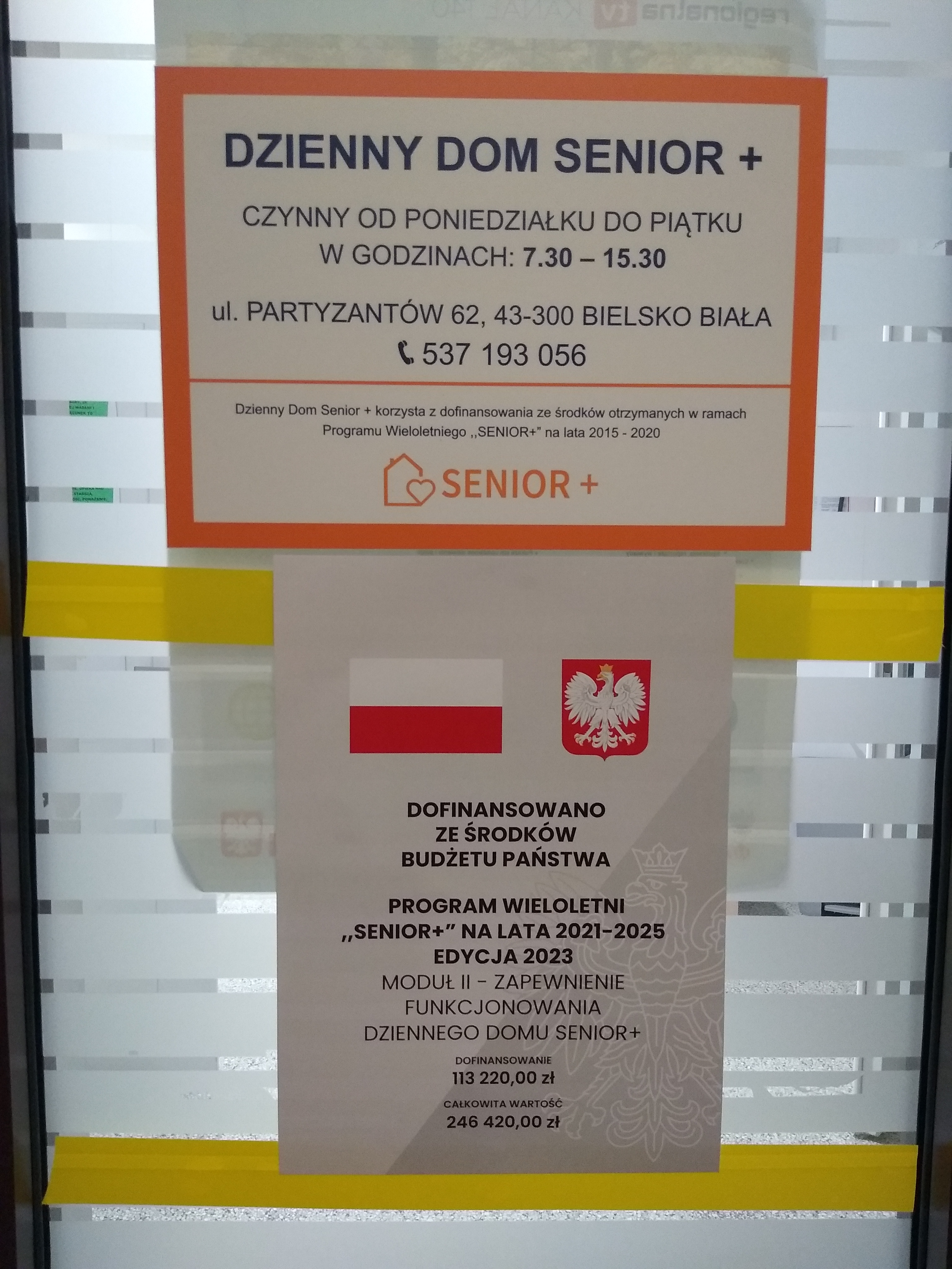 Opis alternatywny zdjęcia przedstawiającego drzwi wejściowe do Dziennego Domu Senior+ przy ulicy Partyzantów 62 w Bielsku-Białej: Na górze drzwi znajduje się plakat z białym tłem i pomarańczową ramką. Granatowymi literami jest napisane: Dzienny Dom Senior+ czynny od poniedziałku do piątku w godzinach 7.30-15.30, ul. Partyzantów 62, 43-300 Bielsko-Biała, telefon 537 193 056. Dzienny Dom Senior+ korzysta z dofinansowania ze środków otrzymanych w ramach Programu Wieloletniego „Senior+” na lata 2015-2020. Na dole jest logo Programu Senior+ czyli pomarańczowy domek z sercem. Poniżej na drzwiach zamieszczono Plakat Informacyjny Programu SENIOR+, który przedstawia u góry flagę i godło Polski, poniżej napis: Dofinansowano ze środków budżetu państwa. Program Wieloletni „Senior+” na lata 2021-2025 edycja 2025. Moduł II: Zapewnienie funkcjonowania Dziennego Domu Senior+. Na dole plakatu napis: dofinansowanie 116 640,00 zł całkowita wartość 260 640,00 zł data podpisania umowy lipiec 2025.